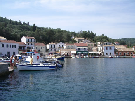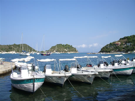 Renting a small boat like one of these in Loggos harbour is a great way to explore the Paxos coastline. The old soap factory can be seen in the top right of the picture.