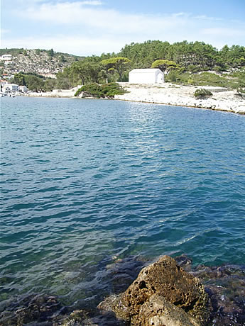 Mongonisi, at the south end of the island, has a sandy beach. Many luxurious yachts moor in the cove.