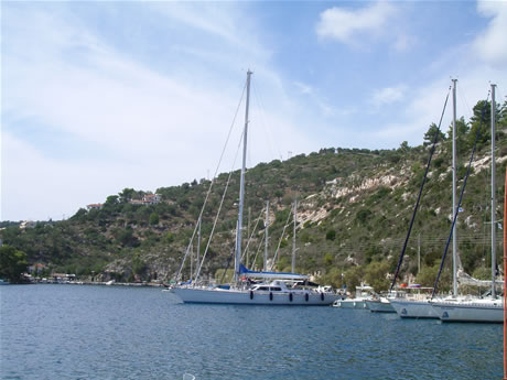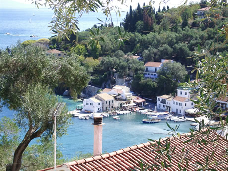 A view of the harbour at Loggos, taken from one of the many pathways that crisscross the island.