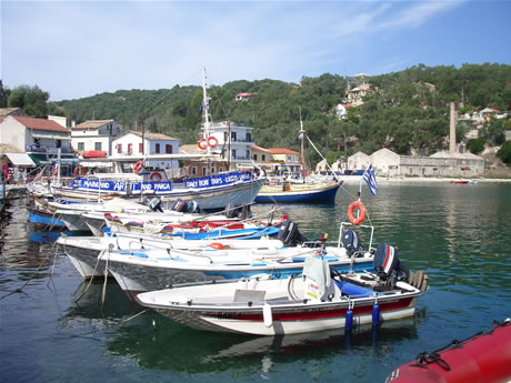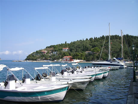 Renting a small boat like one of these in Loggos harbour is a great way to explore the Paxos coastline. The old soap factory can be seen in the top right of the picture.